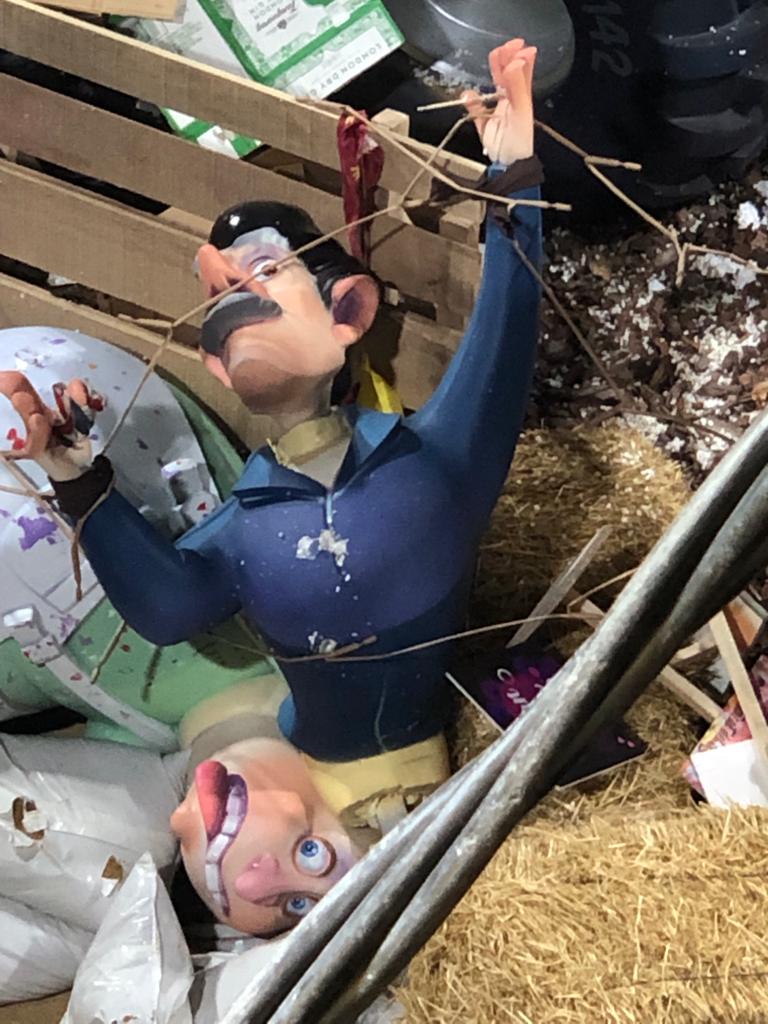 I left town on the afternoon of the 19th, but Jan and Tom shared the following photos with me and commented that the apartment didn’t smell great after the Crema (burning). Please note that the ninot that was on the balcony below Paul’s was knocked down before the fire and became part of the bonfire.