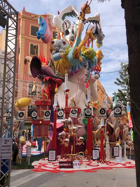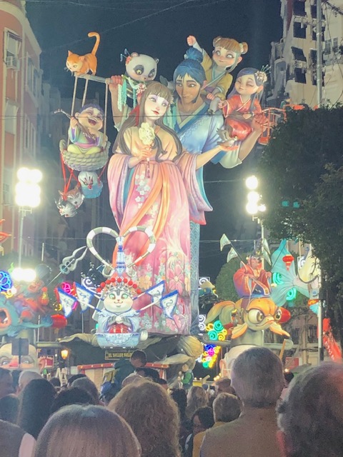 I began my travels by driving from my home in Southern France with my friends Jan and Tom to visit Tom’s brother in Valencia. Arriving by car in Valencia during the Fallas festival is a challenge. Many streets become pedestrian only in the Ruzafa neighborhood where most street corners have a Fallas. A Fallas is a statue (or series of statues called ninots) made out of cardboard, wood, paper-machè and/or plaster. Many of the statues reach towering heights, of 2-3 stories.