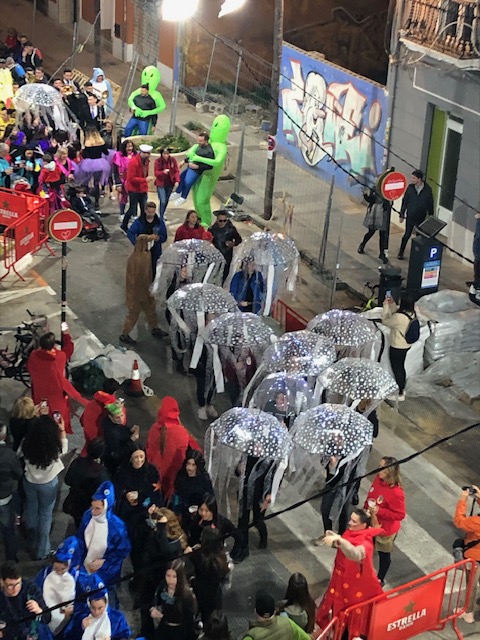 After the first day, the sound of a band had us heading to our perfectly located balcony to observe the progress of the group. By the end of the five day festival, we’d get off the couch, go to the windows and checked they were securely fastened! Not quite, we weren’t that blasé, but close. We only saw one parade that was a break with tradition. Instead of wearing the traje de valenciana (clothes styled mostly after the 18th and 19th century) our neighborhood put one parade on with an oceanic theme: jelly fish, sharks and even a walrus (though there were some inexplicable aliens), but no one minded as they were GREAT costumes.