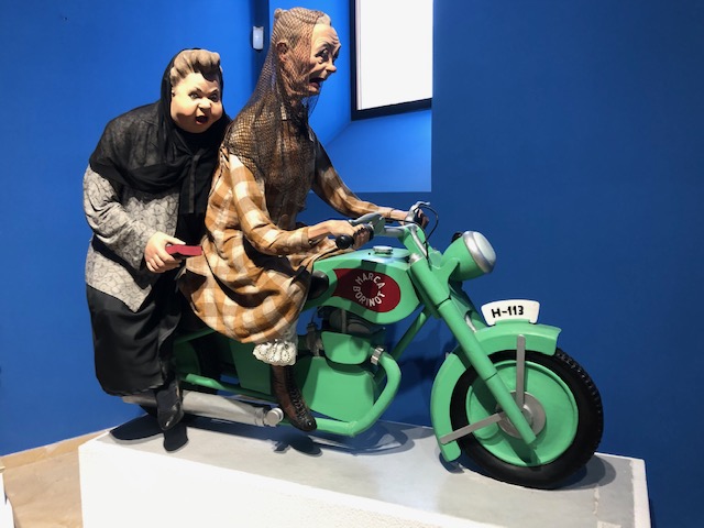 The messages of the ninots have changed over time as you might expect and so have the materials used and the artistic choices that went into them. In the 30s and 40s they depicted traditional Valencian scenes. They were made from wax, wood and cloth and showed craftsmen and popular current figures. In the 50s there developed a sense of narrative which addressed social issues like the shortage of basic goods in the post-war period. Thin cardboard sheets were also coming into use as a layering technique to make more detailed faces. I especially liked this ninot of two old biddies on their way to mass, which coincidentally was from the year of my birth 1958.