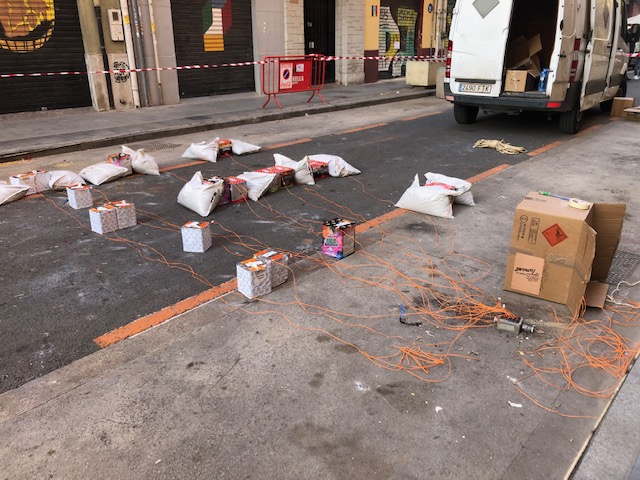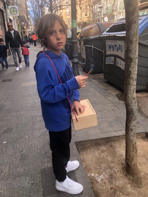 So back to the theme of firecrackers, as you really need to understand how pervasive and impressive this aspect of Fallas is (especially if you are considering coming one year!). We saw multiple stores in the Ruzafa neighborhood selling pirotecnia and each store had a line outside it! Parents buy wooden boxes for their young children to wear around their necks in order to make it easier for them to light and throw firecrackers as they walk through the neighborhood.