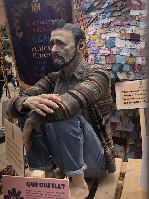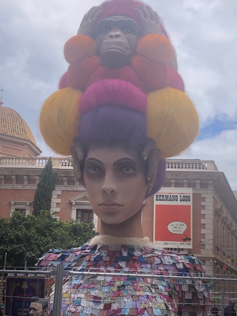 The ninot that was saved this year (as far as I know, based on the prize it won) was my favorite as it is extremely realistic. This was part of a larger Fallas that was quite artistic of a beautiful woman’s bust with colorful hair in which a gorilla was hidden who was covering his own and (magically) her ears. Note the dress is made out of fabric samples. Perhaps a take on hear no evil, see no evil, do no evil in reference to homelessness or unemployment… my interpretation!