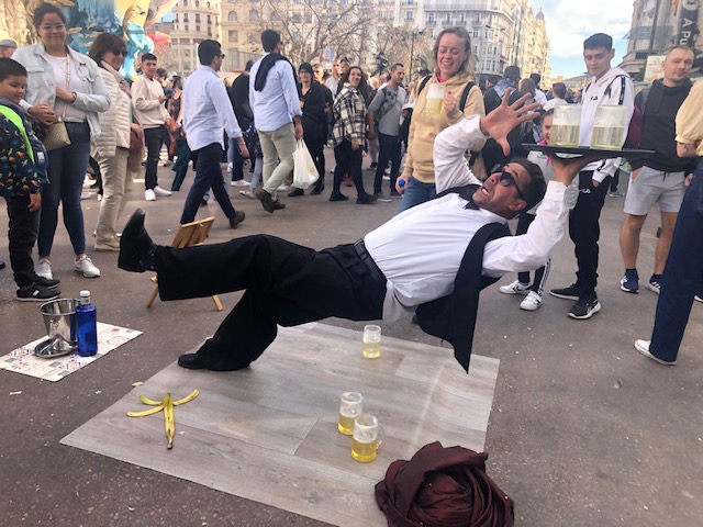 As a kick off to my travels, Las Fallas was amazing and I highly recommend it, but with several caveats. 1. If you hate firecrackers and/or are cranky after an interrupted night’s sleep, don’t come. 2. A refuge from the festivities is a must. 3. If you’ve done it once, you probably don’t need to do it again! And finally here’s a photo of a great living statue that we saw on the Plaza del Ayuntamiento, well after 2:00PM!