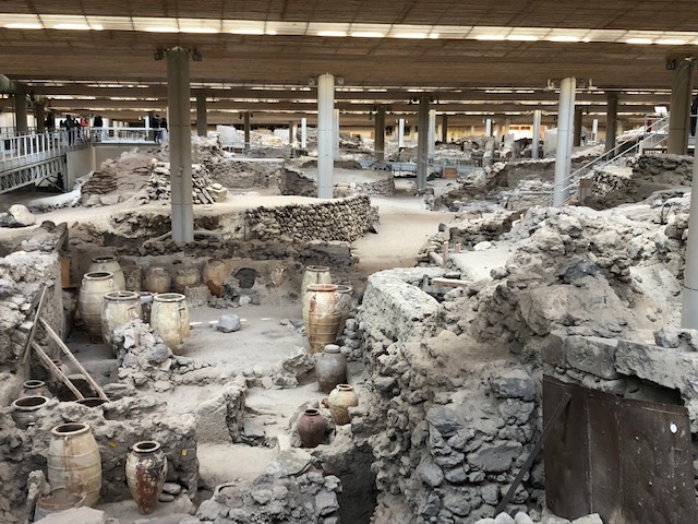 In Akrotiri, due to this volcanic explosion (similar to Pompeii) there is a village that was buried under the ash. The archeological dig there has discovered evidence of human habitation that dates back to the Neolithic Age (4500 BC). Unlike Pompeii, no human remains have been found as there were significant earthquakes before the eruption that gave inhabitants sufficient warning to leave. The whole dig area is covered with a permanent roof and there are walkways around and through the area for tourists. I highly recommend this, though all you see are the remnants of the homes and the lay out of the streets and water/sewage systems. All of the decorations and utensils that have been discovered are either in Athens or in the small prehistoric museum in Fira. The dig has been going on for 40 years and is expected to take a total of 200 years! I suppose when you are moving cubic meters of ash with nothing but brushes, it takes time!